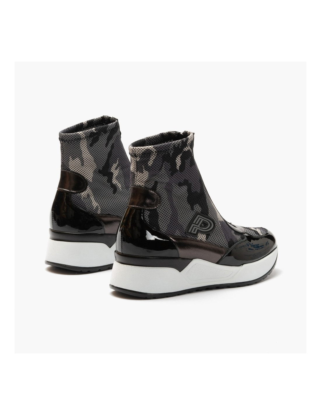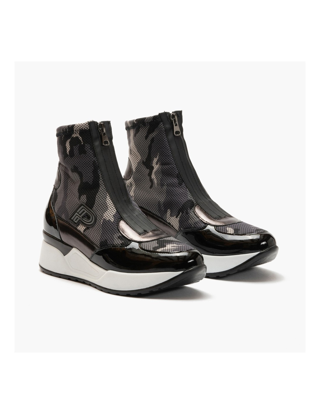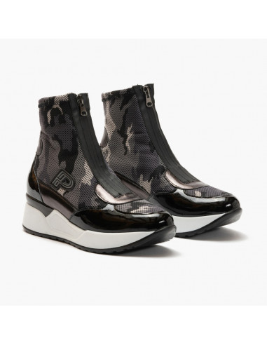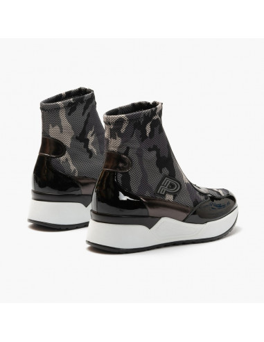 Derroche estético en un botín deportivo de tipo calcetín en combinación de print camuflaje y piezas de charol, con cremallera frontal waterproof, para aguantar los peores días de frío y lluvia. Plantilla extraíble
