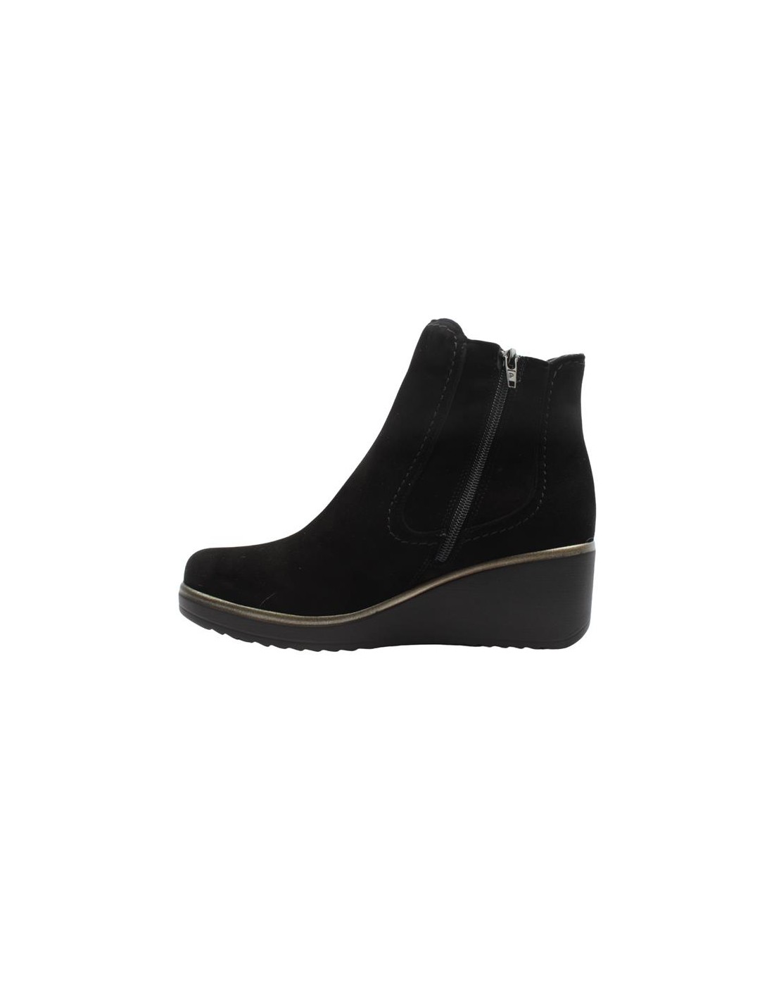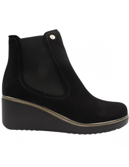 Botin chelsey de ante negro, cierre con cremallera interior y por el exterior goma elástica. piso con cuña de 6cm con inclinación real de 4cm