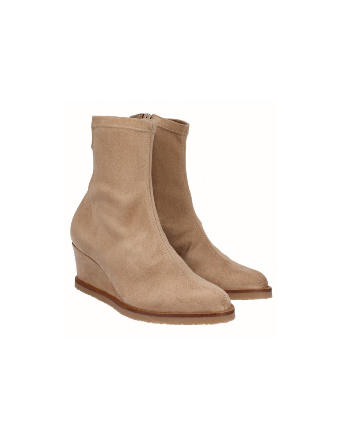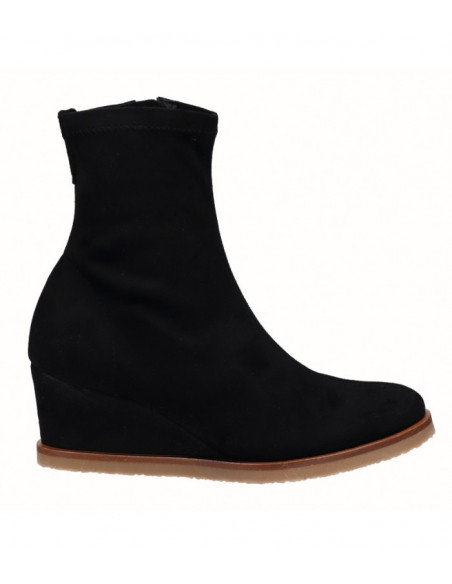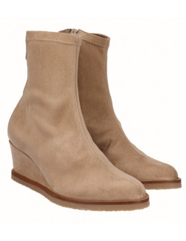 Botín de cuña de 6,5 cm, con puntera redondeada en beig y negro, fabricados en licra de alta calidad y con plantilla de gel acolchada. Cierre mediante cremallera lateral. Comodidad, durabilidad y versatilidad de un calzado 100% español. Cuenta con la garantía de calidad de Alpargatas Viguera.