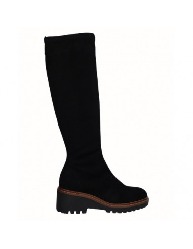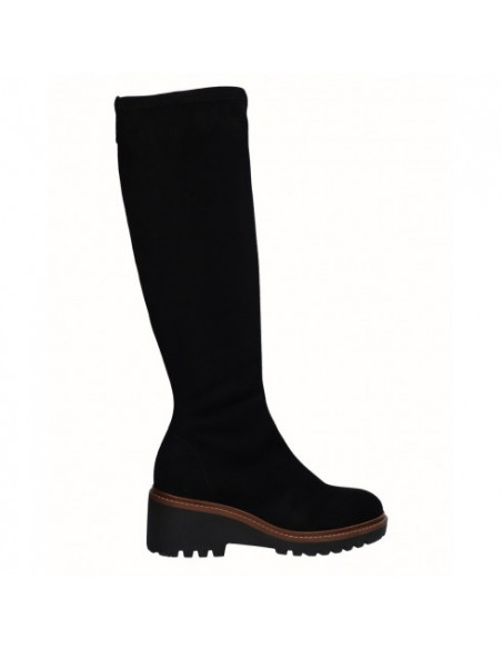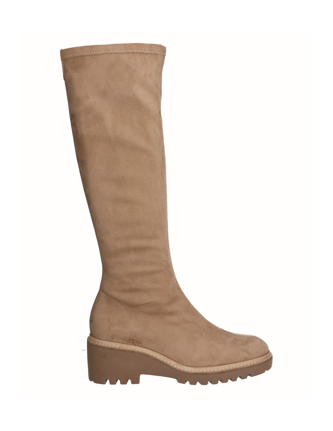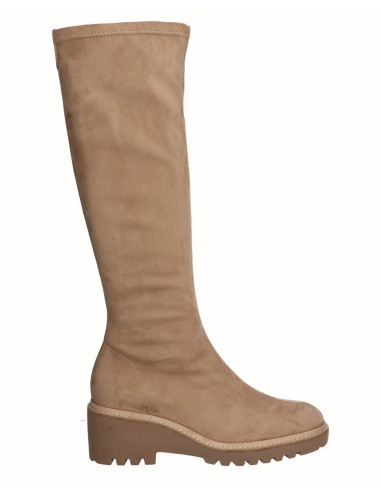 Bota alta con cuña de 6 cm y puntera redondeada en tono beig y negro, fabricadas en licra de alta calidad. Cierre mediante cremallera lateral. Este bota cuenta con una plantilla acolchada que nos aporta flexibilidad y confort en la pisada. Comodidad, durabilidad y versatilidad de un calzado 100% español. Cuenta con la garantía de calidad de Alpargatas Viguera.