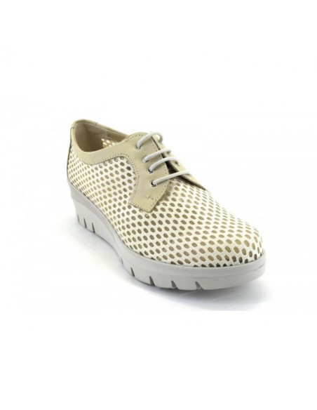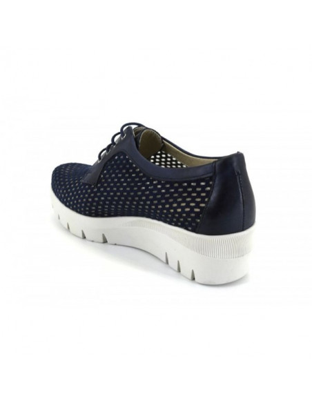 Un calzado fresco para primavera, que a pesar de ser cerrado te ofrece una perfecta transpirabilidad gracias a la rejilla que ocupa el 80% de la superficie. Boogie de pitillos en tono azul y beig con plantilla extraíble y altura de 4,5 cm.
