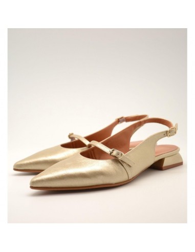 Zapato plano destalonado dorado con punta fina, tira fina con hebilla en el empeine, hebilla ajustable en el talón y tacón con forma geométrica