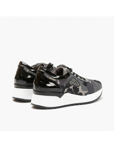 Deportivo con plataforma con diseño de camuflaje y vivos en charol. Los cordones se sustituyen por elásticos ajustables para calzarse en un segundo. Te sorprenderán las miles de combinaciones que podrás hacer. Plantilla extraíble