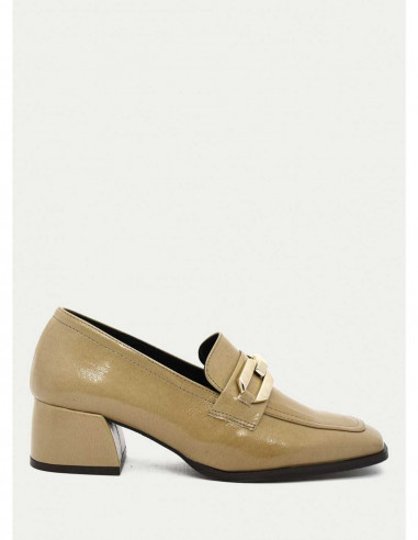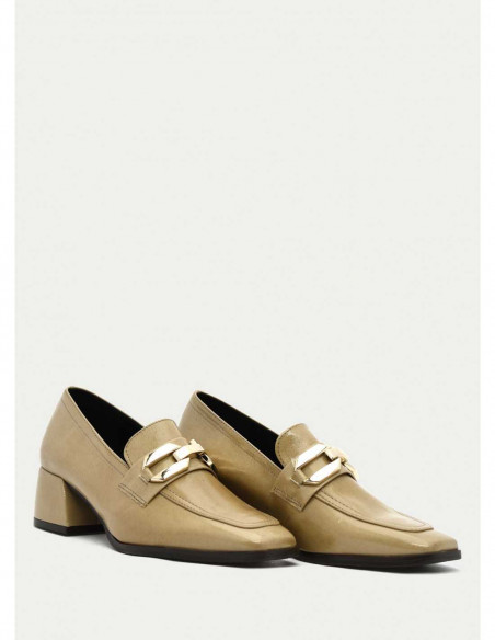 Mocasín tacón Daniela Vega con acabado en krokante. Horma punta cuadrada. Plantilla confort en piel. Detalle hebilla dorada. Tacón cuadrado alto de 5cm