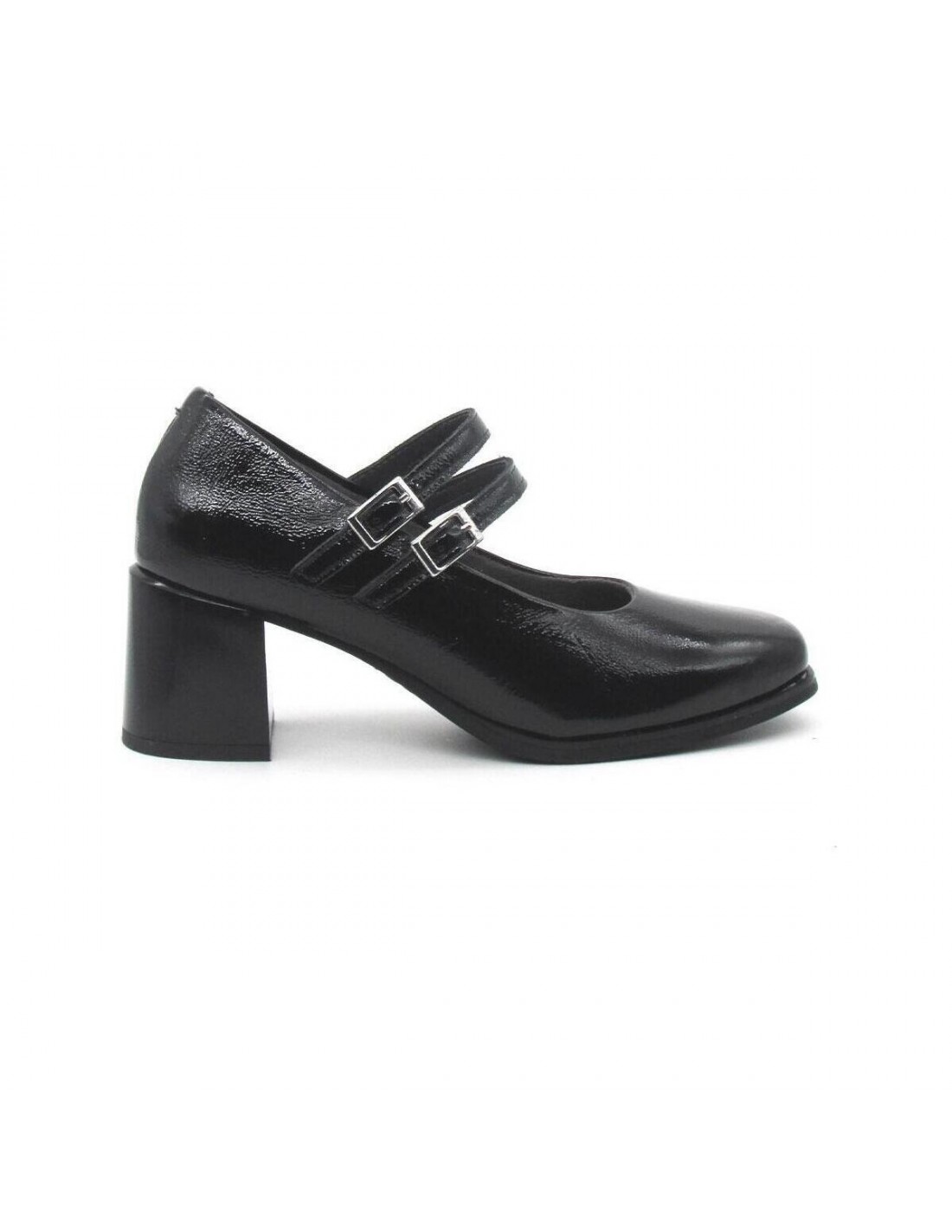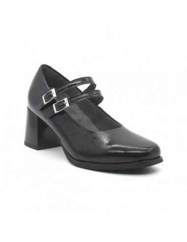 Fabricado en España en piel de primera calidad, con acabado en charol. Detalle de cierre con dos hebillas y puntera cuadrada. Forro interior con un tejido muy suave al tacto y térmico. Plantilla extraíble que proporciona gran sensación de confort y bienestar, con nombre de la marca grabado. Suela de goma antideslizante, con tacón de apróx. 6cm de altura para estilizar la figura.