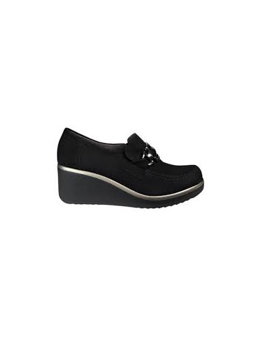 Zapato tipo mocasín con hebilla de adorno y de ante negro. Piso con cuña de 6cm con inclinación real de 4cm